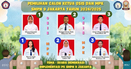 SMP Negeri 9 Jakarta mengadakan pemilihan ketua OSIS dan MPK periode 2024/2025 untuk menggantikan ketua OSIS yang sebelumnya diketuai oleh Farras Hadyan P. dan ketua MPK yaitu Clarissa Angelica H.P. Sebelum pemilihan calon ketua OSIS dan MPK, tim kesiswaan SMP Negeri 9 Jakarta telah mengadakan seleksi untuk menetapkan bakal calon ketua OSIS dan MPK.